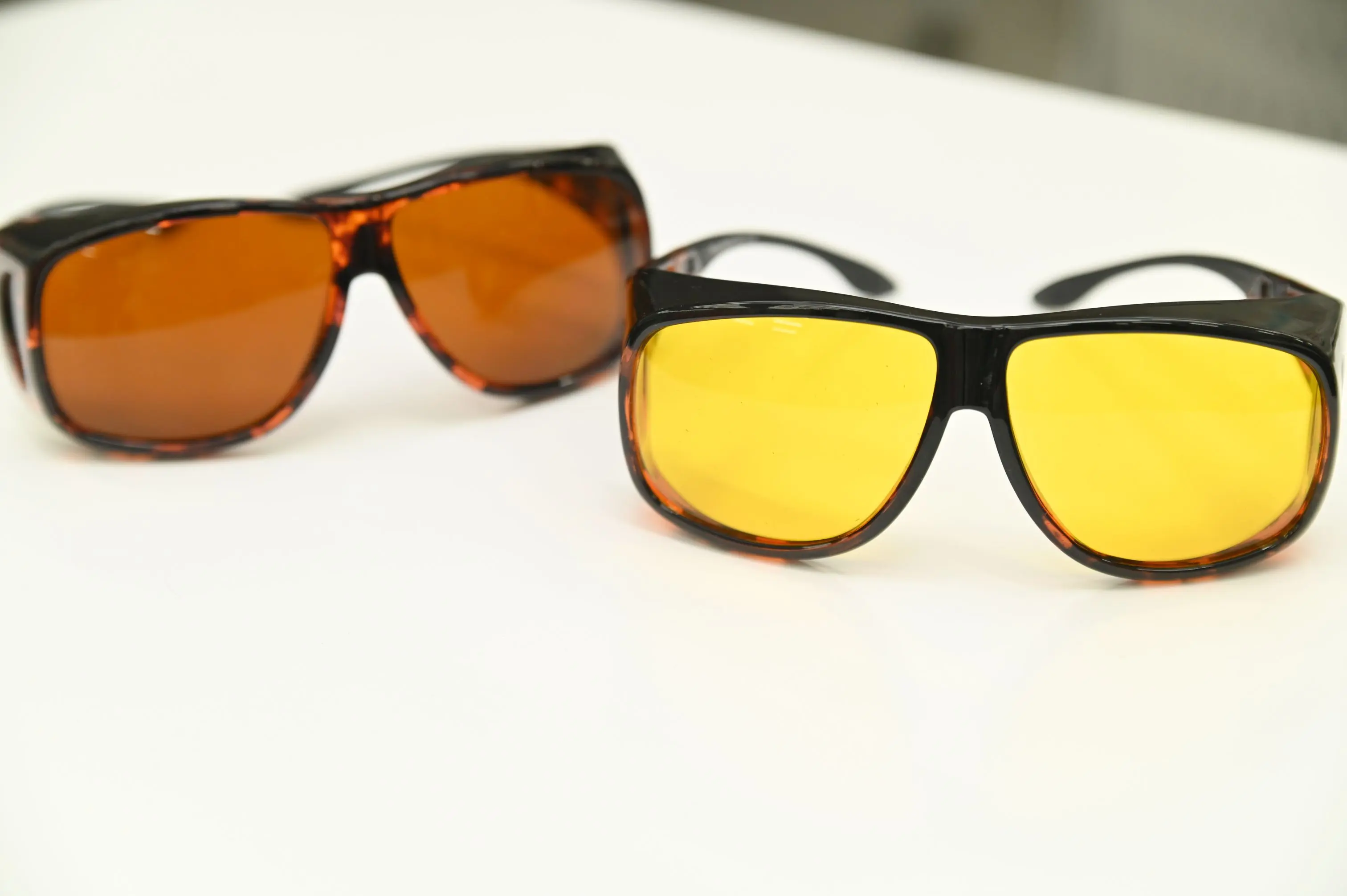 眩しさを軽減させたり、コントラストの改善を目的に装用する「遮光眼鏡」。様々な色のレンズがあり、視能訓練士の指導のもと用途に応じて試しながら選びます。