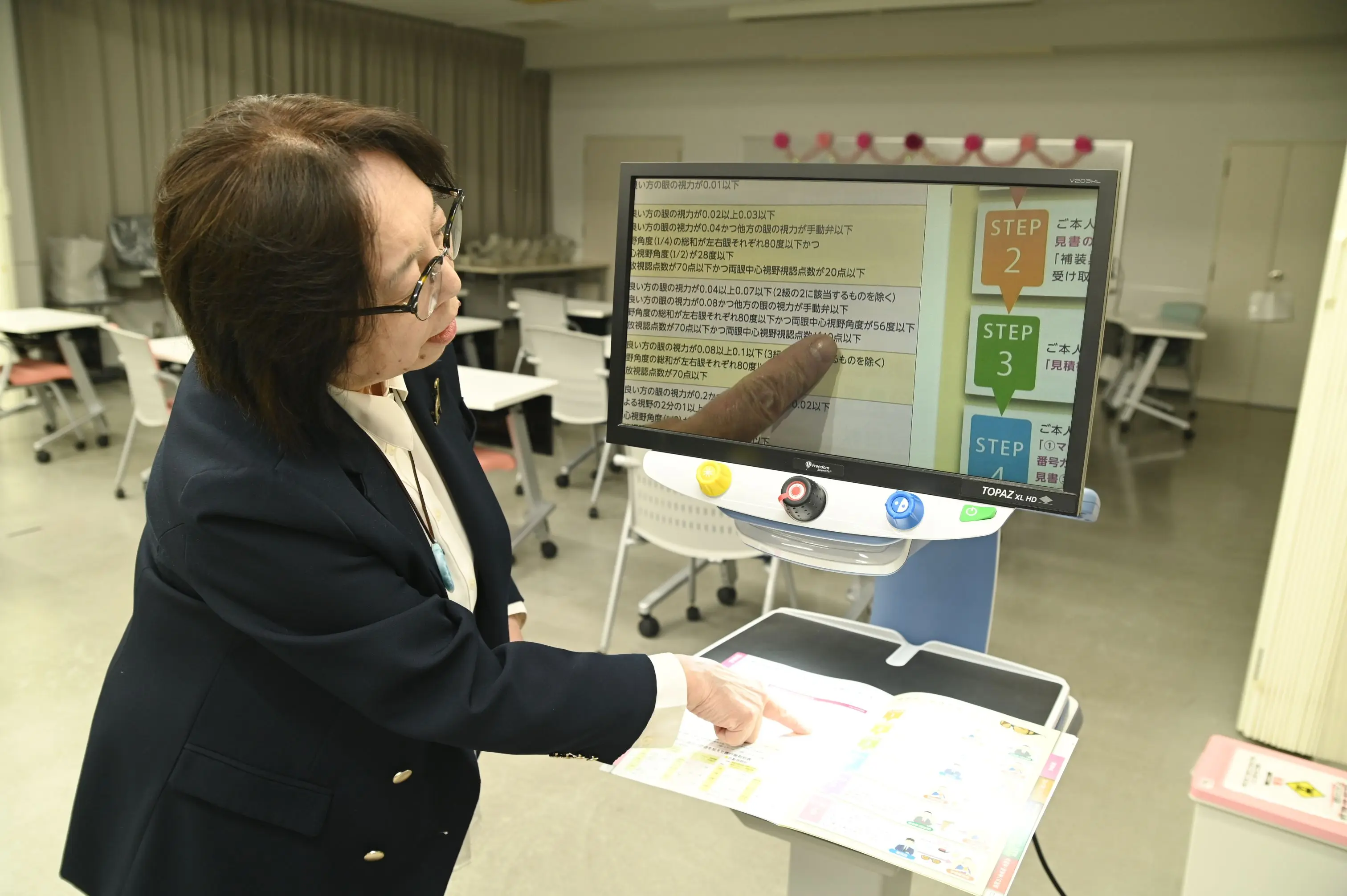 モニタに文字や絵を大きく写し出し、新聞や本などが読める「拡大読書器」。「読んだり見たりするだけでなく、例えば爪を切る時や針に糸を通す時にも便利なんですよ」と小野先生。