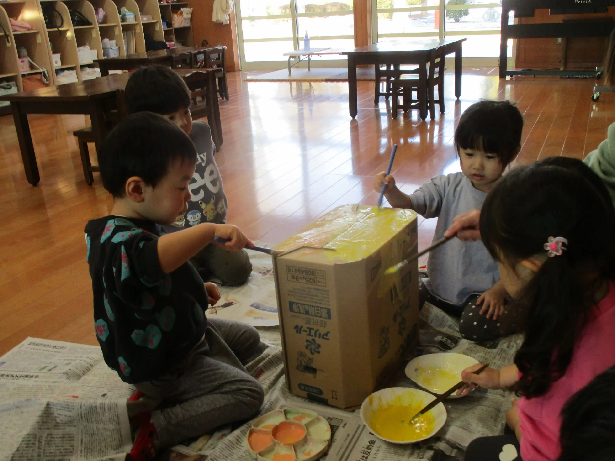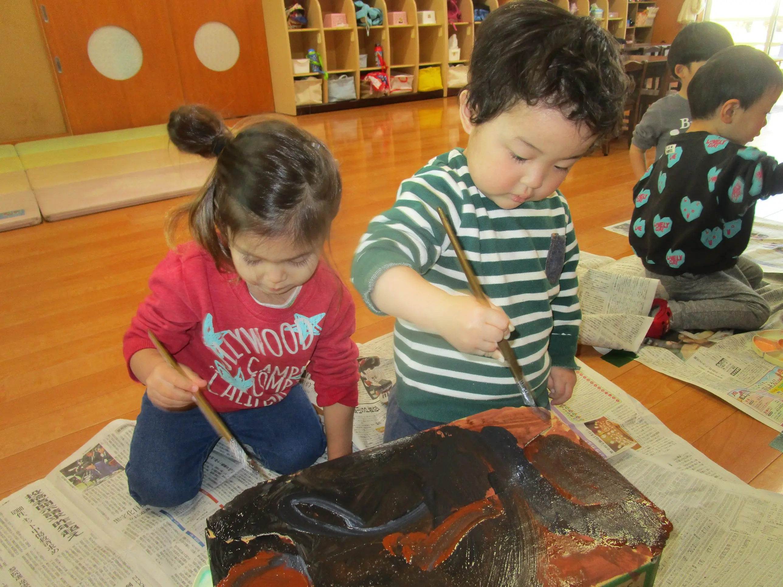 みんな茶色や黒色、黄色など好きな絵の具の色で真剣に色塗りをしました?
